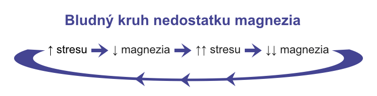 Katecholaminy a kortikosteroidy uvolňované během stresu zvyšují přesun magnezia z buněk do extracelulárního prostoru, což vede k jeho zvýšenému vylučování a následné hypomagnezemii. Na druhou stranu nízké sérové koncentrace magnezia zvyšují v podmínkách stresu uvolňování katecholaminů, ACTH a kortizolu, a tak ovlivňují jejich přístup do mozku. Zjednodušeně řečeno, stres způsobuje hypomagnezemii a snížení sérové koncentrace magnezia vede k nadměrnému vylučování stresových hormonů, tedy prohlubuje stres. Vytváří se tak začarovaný kruh, ve kterém je dominantní snížená odolnost organismu vůči stresu a následné vyčerpání zásob magnezia v organismu.
