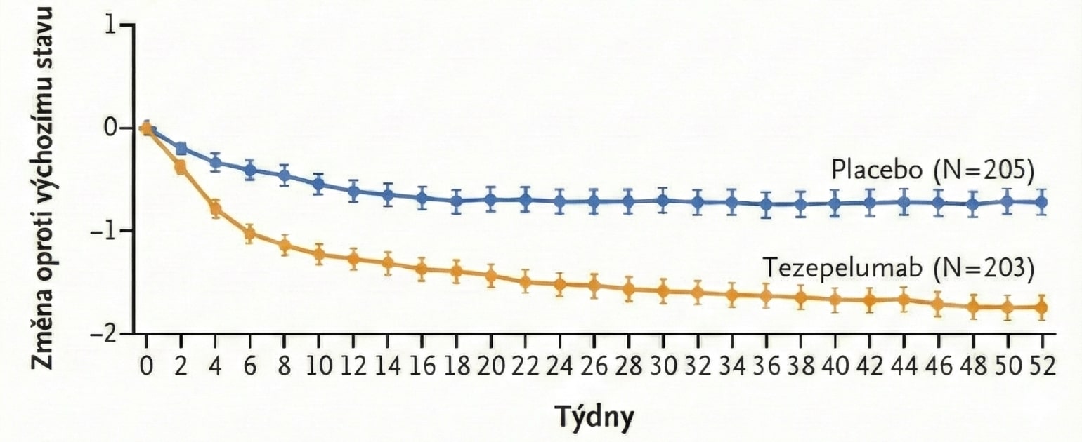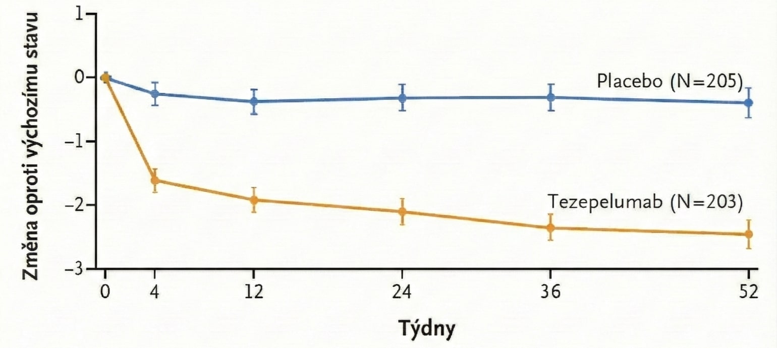 Pacienti užívající tezepelumab vykazovali významné zlepšení oproti placebu (průměrný rozdíl −2,07; p < 0,001). Zlepšení bylo pozorováno již od prvního posouzení po podání terapie (4. týden) a bylo udržováno po celých 52 týdnů.