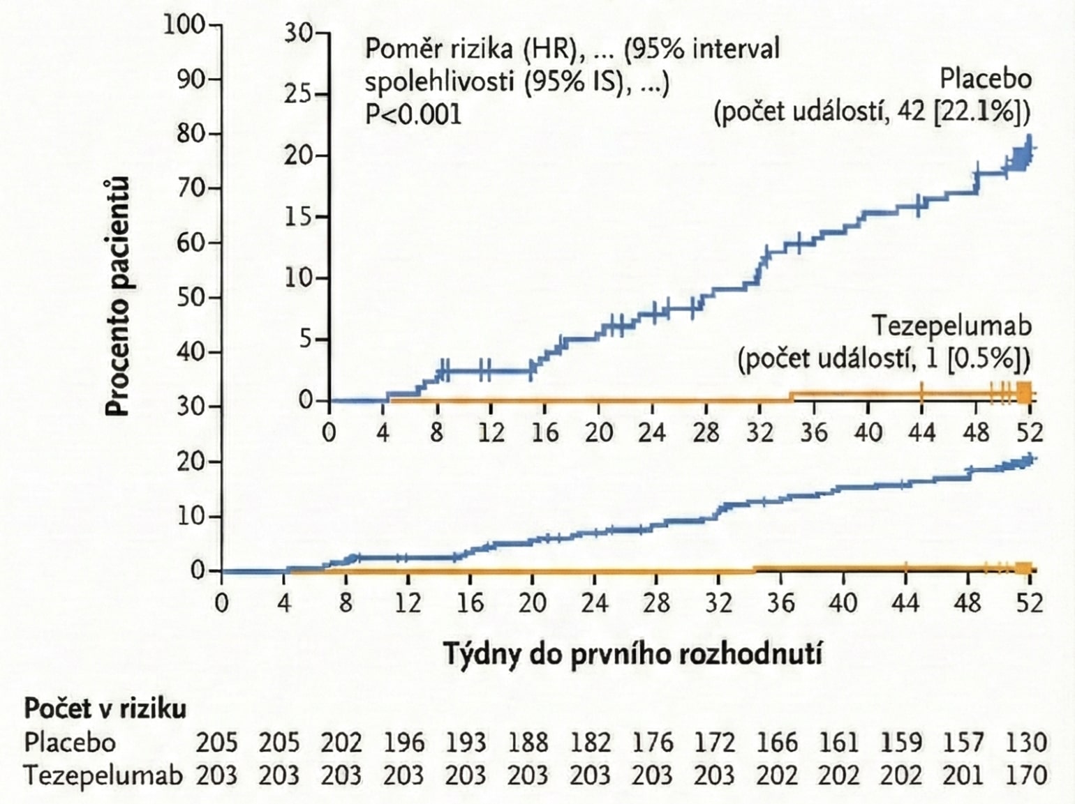 • Zhoršení CRNP bylo častější ve skupině s placebem (22,9 %) než s tezepelumabem (5,4 %).