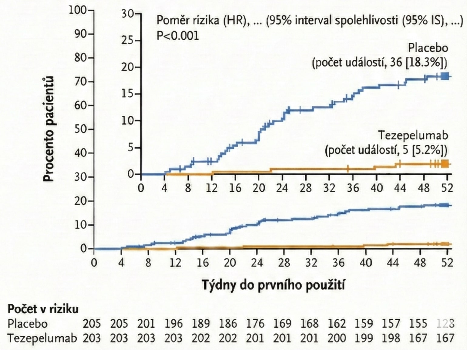 Graf demonstruje významné snížení potřeby záchranné léčby. Použití systémových kortikoidů bylo u pacientů léčených tezepelumabem výrazně nižší po celou dobu trvání studie (52 týdnů). Křivka znázorňující kumulativní procento pacientů vyžadujících kortikoidy stoupá výrazně méně u skupiny s tezepelumabem než u skupiny s placebem. Během 52 týdnů činila spotřeba systémových kortikoidů u skupiny s tezepelumabem (n = 203) 5,2 % (5 událostí), zatímco u skupiny s placebem (n = 205) dosáhla 18,3 % (36 událostí).